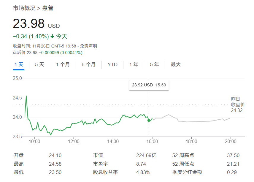 消息公布后,惠普股价一度下跌6%。