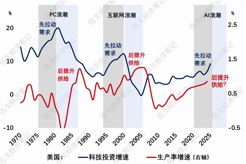 当前市场对AI存在“泡沫”与否的争议,但全球来看,相关投资正拉动上下游增长,应用前景短期似难证伪。今年以来美国科技相关投资对其GDP增长的贡献度高达6-7成。史实表明,科技当期拉动投资需求,未来提升供给能力,对物价是先升后降的非线性影响。