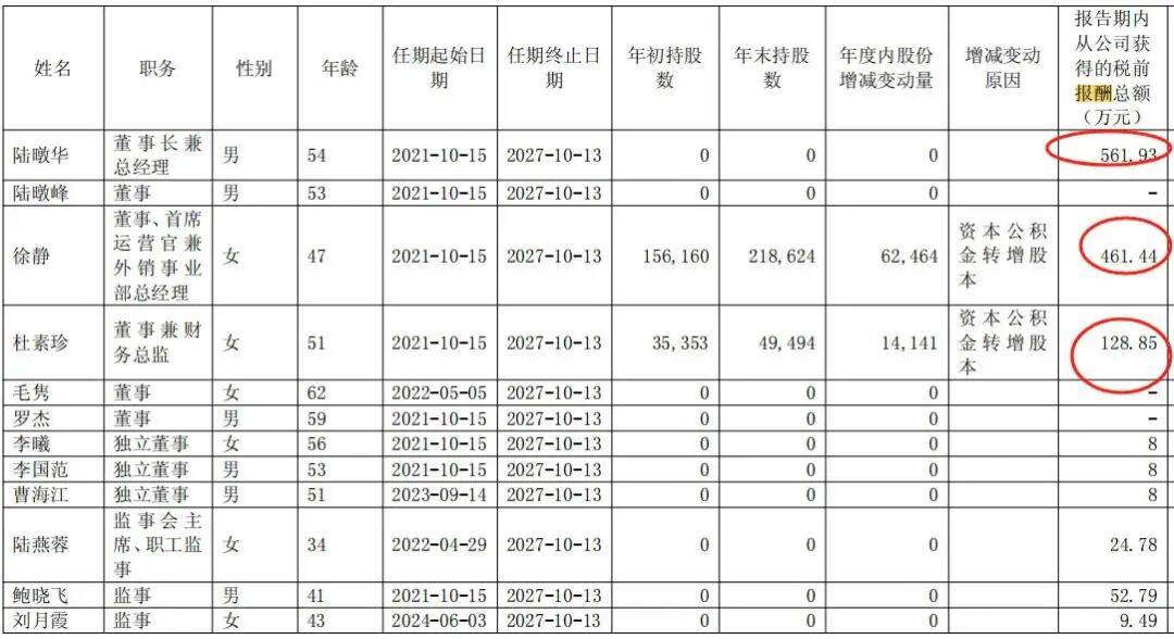 2022年,董事长陆暾华报酬总额72.27万元,董事徐静219.11万元,董事兼财务总监杜素珍86.34万元,制造总监马其刚116.52万元,高管层合计薪酬671.83万元。