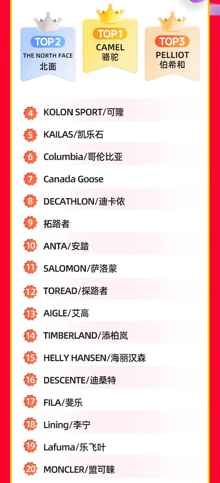 牧高笛的真正危机,并非仅源于露营风口消退,更在于错失了户外消费的下一个主赛道——以冲锋衣为代表的户外服饰。近年来,户外服装赛道的大众消费需求暴涨,以天猫双11户外品牌销售榜来看,骆驼、北面、伯希和占据前三,凯乐石、拓路者、安踏等也挤进前列。然而,榜单不见牧高笛的名字。