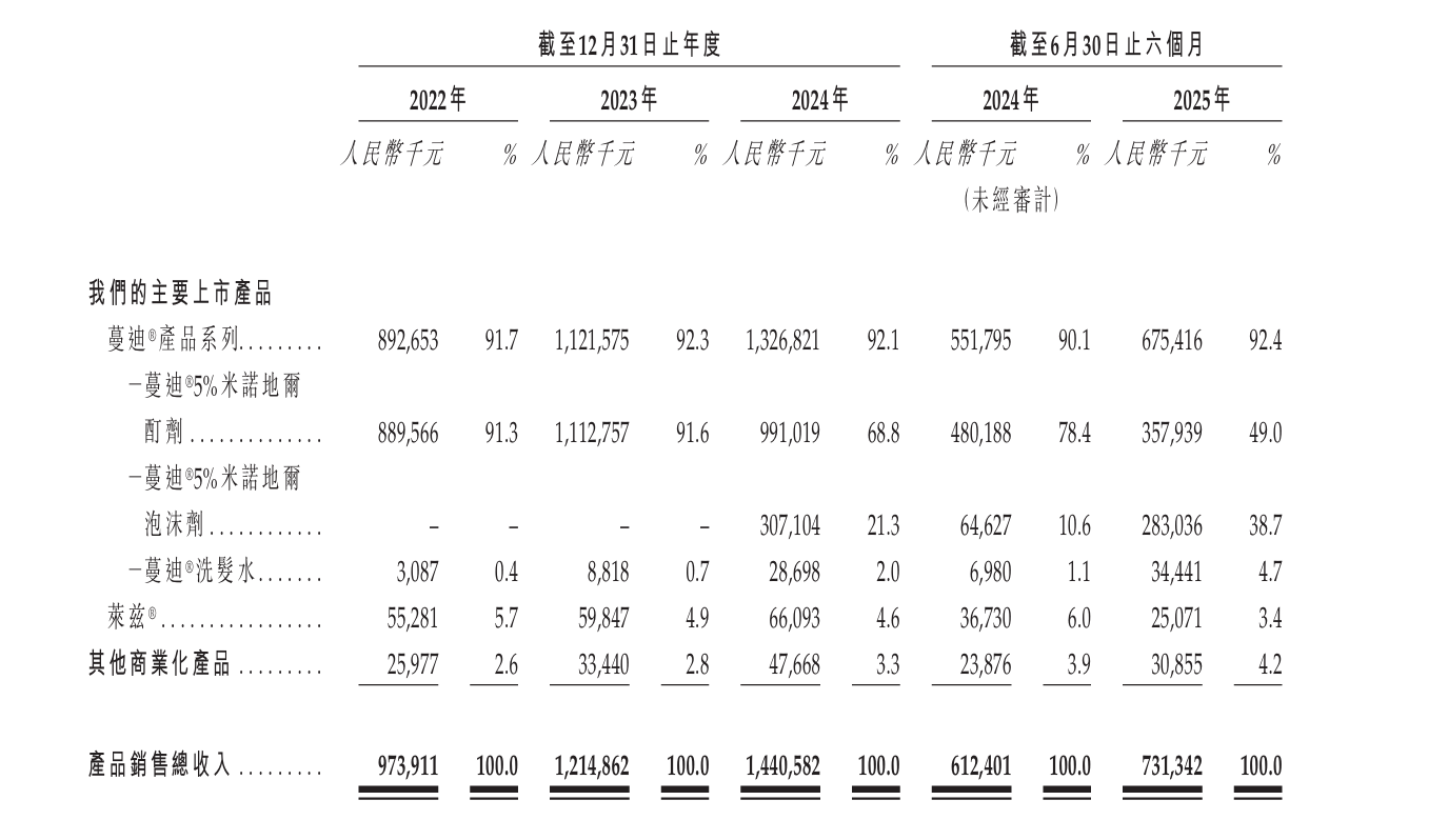 值得注意的是,亮眼数据背后,业务结构失衡问题日益凸显。蔓迪系列产品贡献了公司超九成收入,该系列产品包括蔓迪5%米诺地尔酊剂、蔓迪5%米诺地尔泡沫剂及蔓迪洗发水。招股书显示,2022年至2024年,蔓迪系列产品实现营收8.93亿元、11.22亿元、13.26亿元,分别占产品销售总收入的91.7%、92.3%、92.1%。
