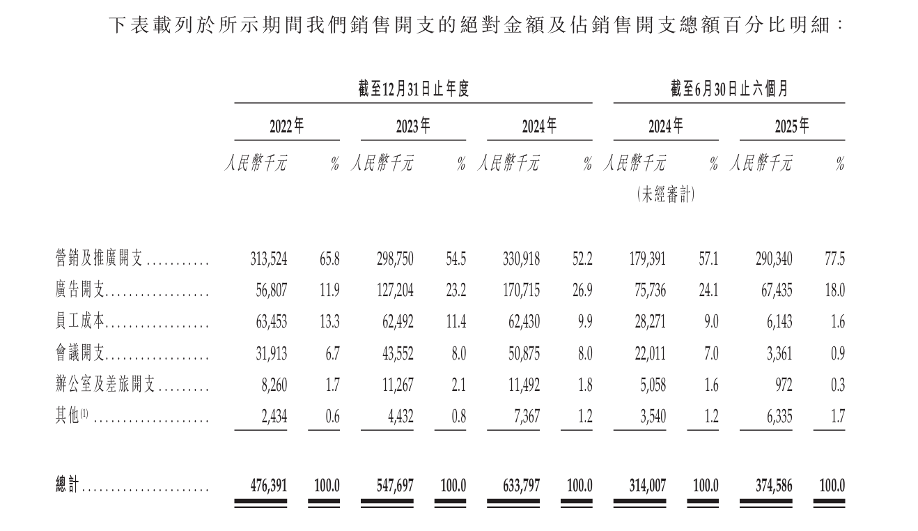 在业绩增长的同时,蔓迪国际的营销费用也呈现出逐年上升的趋势。招股书显示,2022年至2024年,公司的销售及营销开支分别为4.76亿元、5.48亿元和6.34亿元,占营业收入的比例分别为48.5%、44.6%和43.6%。主要用于线上推广、品牌建设。