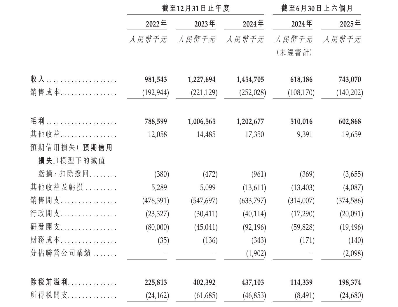 根据招股书披露的数据,2022年至2024年,蔓迪国际的营业收入从9.82亿元增长至14.55亿元,复合年增长率高达21.7%。净利润方面,同期内从2.02亿元增长至3.90亿元。同期内其毛利率分别达到80.3%、82.0%和82.7%;净利率方面,同期内分别为20.5%、27.8%和26.8%。