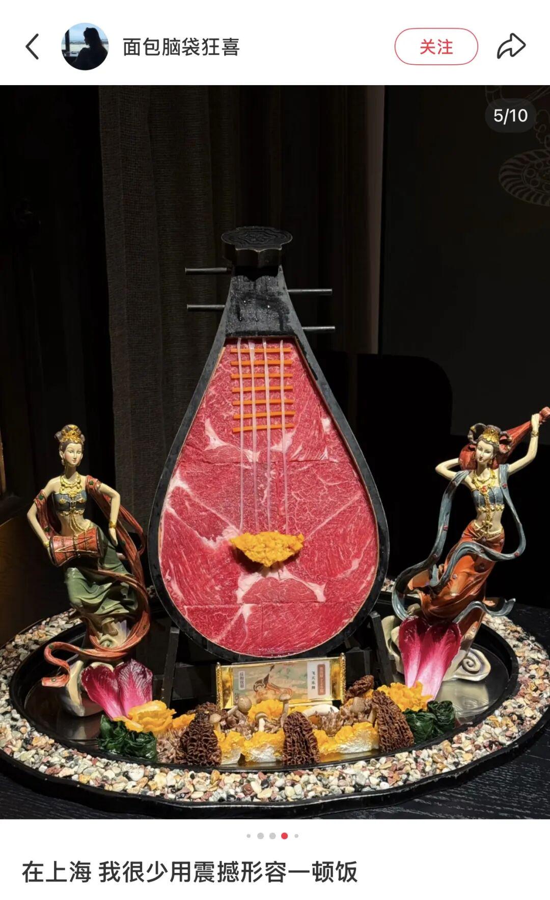 上海外滩一家酒店,则开发出了敦煌飞天主题,把雪花牛肉摆到琵琶之上,海胆、百合切片摆成花朵形状,每一道菜都精致考究。