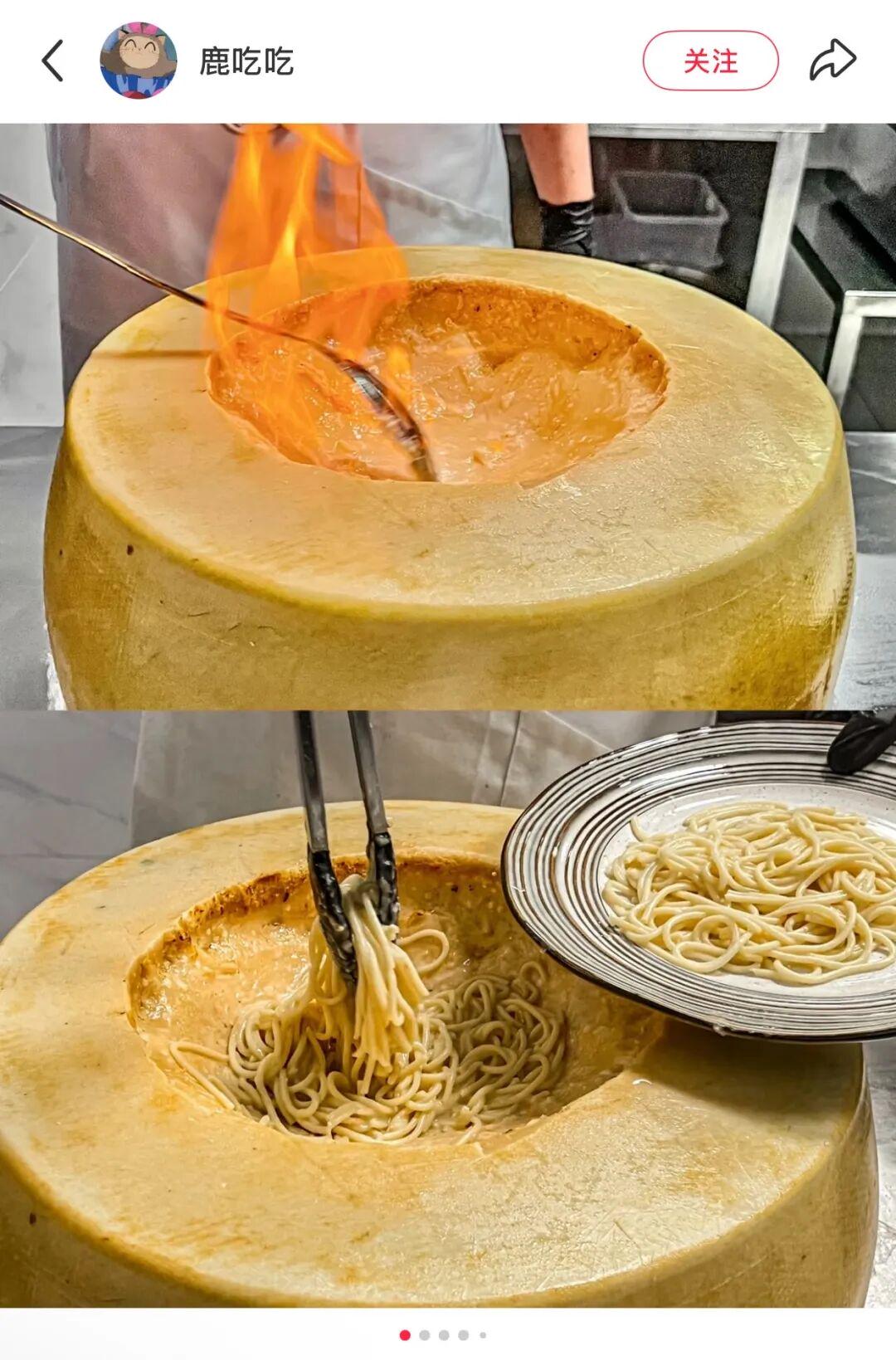 号称一万多的超大车轮芝士,由服务员现场拿起喷枪点火加热,再将煮好的意面放进去搅拌,一份88元的“车轮芝士意面”便制作完成了。