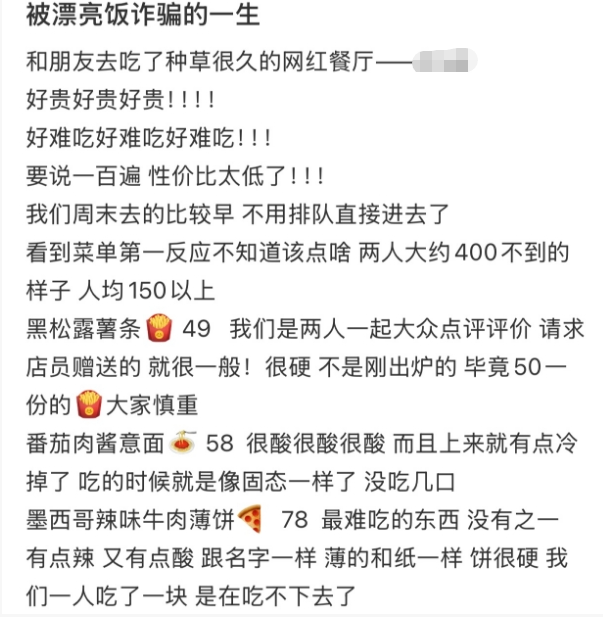 有网友指出这类餐厅的套路便是“用颜值吸引你,用价格筛选你,用社交绑架你”,一些漂亮饭的味道和分量,不足以撑起它们的价格,性价比堪忧。