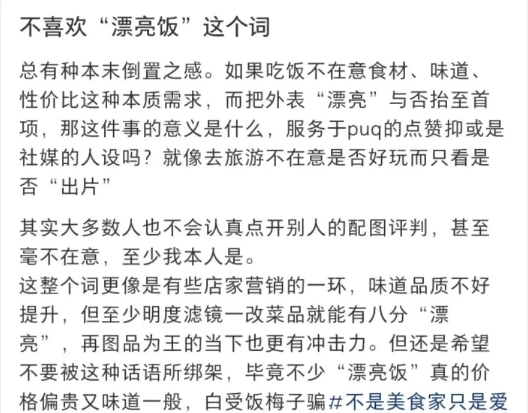 但当身边人都开始打卡,漂亮饭俨然成为“流水线景点”,社交价值大幅缩水。