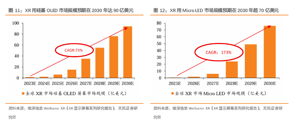 被寄予厚望的Micro LED技术,则被视为更理想的AR解决方案。它具备高亮度、长寿命的核心优势,能更好地满足全天候使用场景。尽管前景广阔,但Micro LED目前受制于制造工艺不成熟和良率较低等问题,距离大规模量产尚需时日。天风证券援引维深信息Wellsenn XR的预测数据,AI眼镜等XR新品的密集发布将持续拉动微显示器需求,预计到2030年,XR用Micro OLED和Micro LED的市场规模将分别攀升至94亿美元和76亿美元,呈现出双技术路线并行的强劲增长轨道。