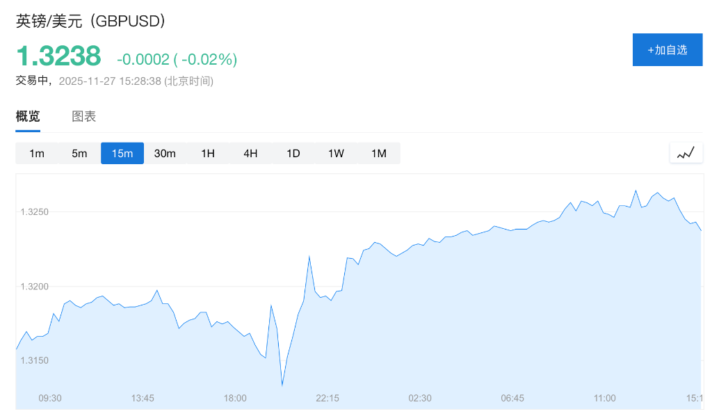 英国预算案公布后,英镑成为市场焦点。当地时间周三,英国财政大臣公布秋季预算报告,财政缓冲增至220亿英镑,大幅下调2026年GDP增速至1.4%。其细节意外提前泄露,市场反应剧烈,英镑汇率上扬。当前英镑兑美元小幅回落,抹去部分涨势。