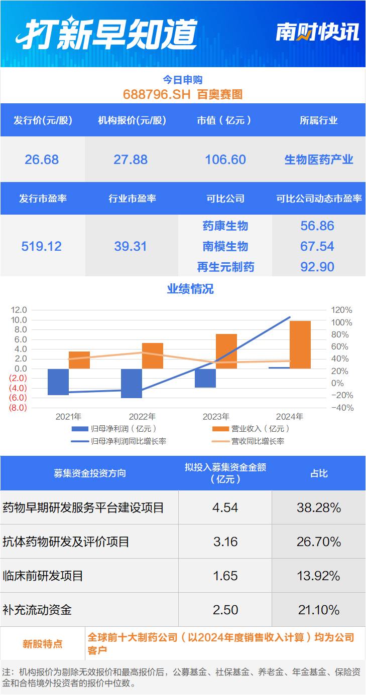 此外,百奥赛图提示,公司可能存在行业监管政策变动的风险。公司主要服务于创新药研发企业。创新药研发是一个受监管程度较高的行业,各个国家地区的药品临床试验及部分临床前试验均受到当地监管部门相应的法规监管及政策指导,例如实验动物在临床前及IND申报中的使用要求、境外创新药相关政策等。若公司不能及时调整自身经营战略来应对我国及境外相关国家或地区医药研发产业政策和行业法规的变化,将可能会对经营产生潜在的不利影响。