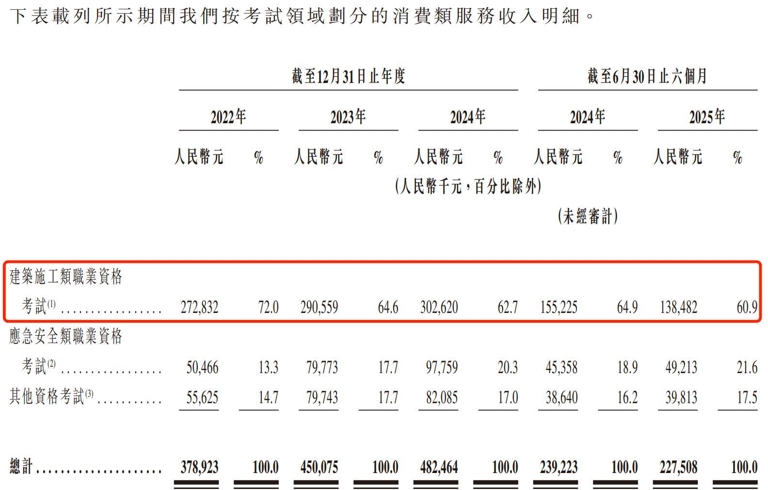 这一变化直接体现在嗨学网的业绩中:2022年至2024年,其建筑施工类考试收入从2.73亿元缓慢增长至3.03亿元;2025年上半年该业务收入1.38亿元,同比下滑11%。