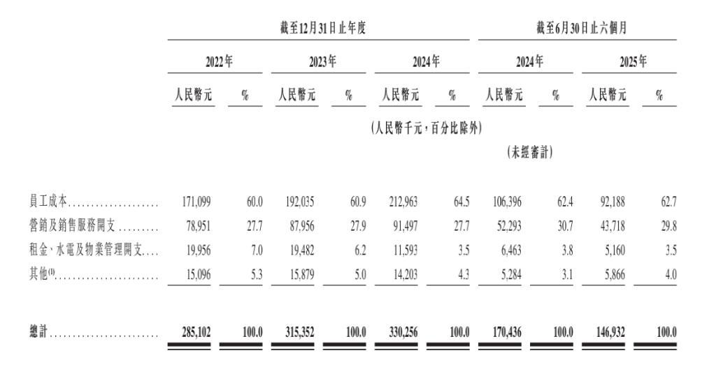 从人员结构看,截至2025年上半年,公司1258名全职员工中,销售及营销人员占比高达80%,达1006人,而讲师及其他教学辅助人员仅133人,占比10.6%,研发人员更是只有57人,占比4.5%。