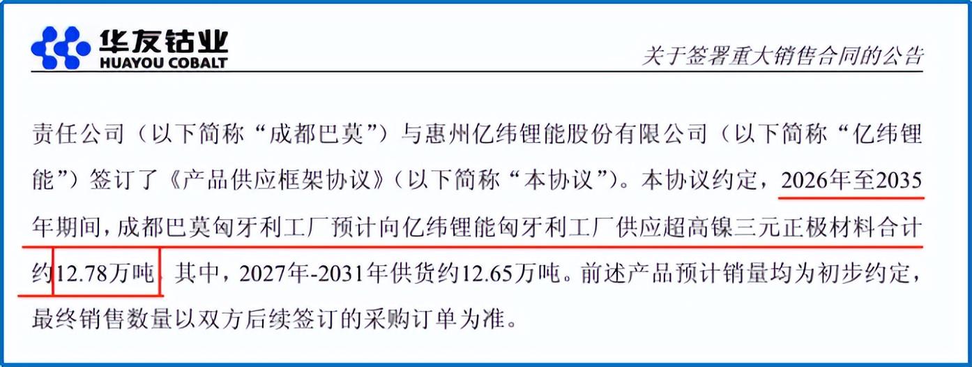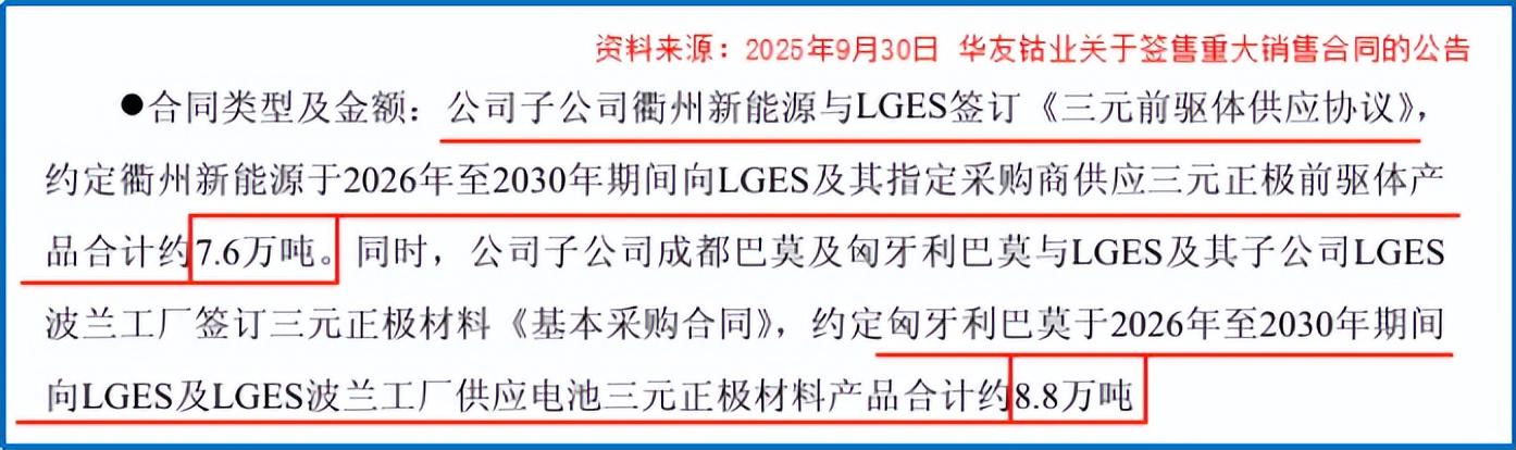 早在今年9月30日,华友钴业就公告与LG新能源签署长期供货合同,约定在2026年至2030年间,为其供应三元前驱体约7.6万吨、电池三元正极材料约8.8万吨。