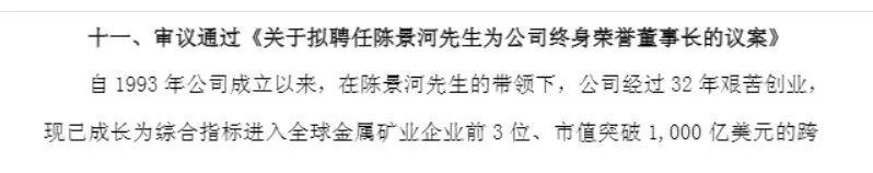 紫金矿业拟聘任陈景河为终身荣誉董事长、高级顾问,并将此安排写入《公司章程》。陈景河将继续在重大战略决策、资源对接等方面为公司提供指导与支持。