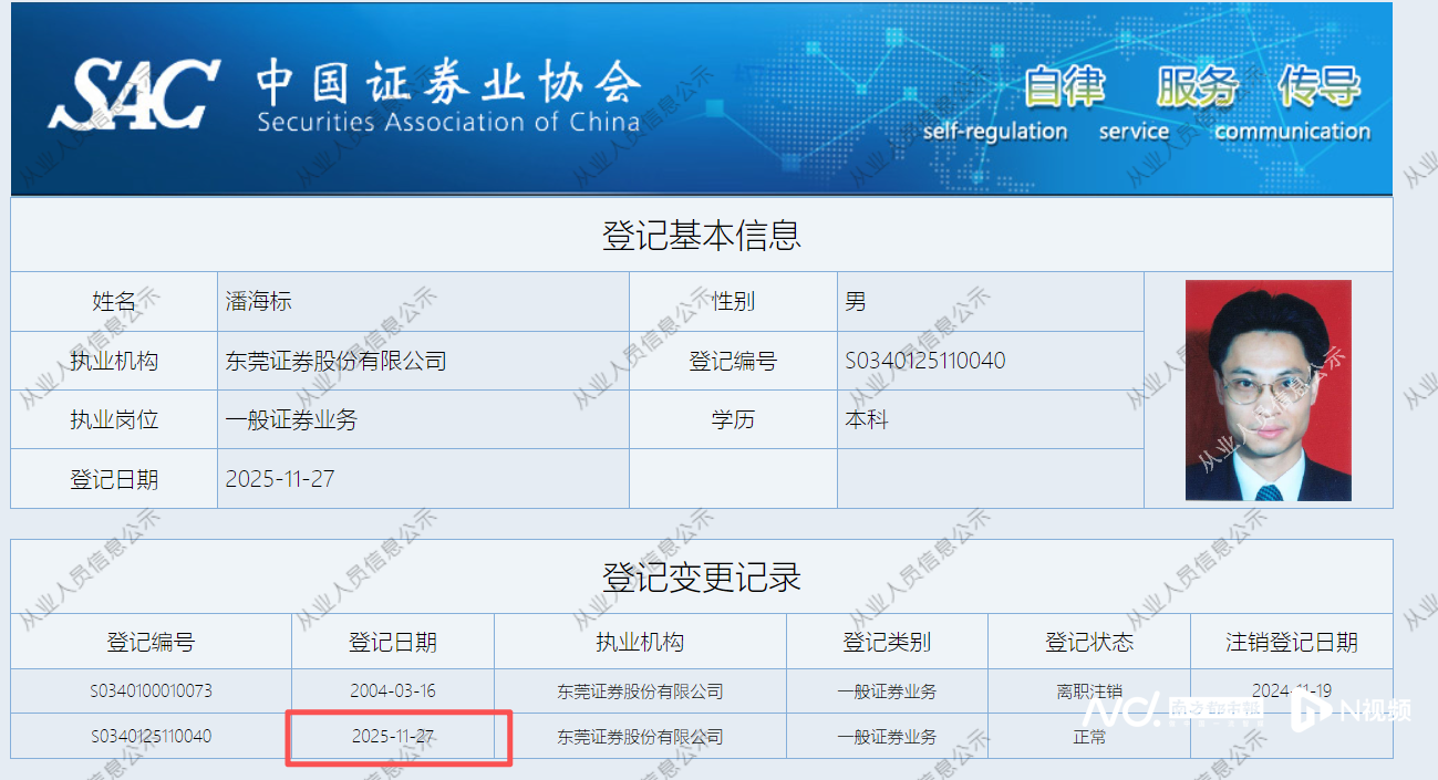 南都湾财社记者从中国证券业协会的“从业人员信息显示”查询获悉,潘海标在东莞证券的“登记状态”在2024年11月19日变更为“离职注销”,在11月27日重新更新为“正常”。