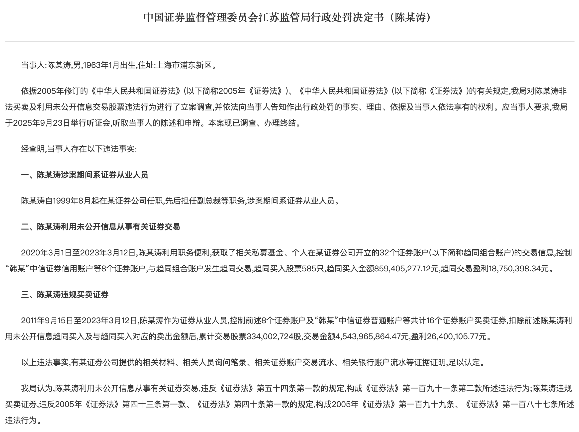 其二,存在长期违规买卖证券的行为。2011年9月15日至2023年3月12日,陈某涛作为证券从业人员,控制前述8个证券账户及"韩某"中信证券普通账户等共计16个证券账户买卖证券,扣除前述陈某涛利用未公开信息趋同买入及与趋同买入对应的卖出金额后,累计交易股票3.34亿股,交易金额45.44亿元,盈利2640万元。