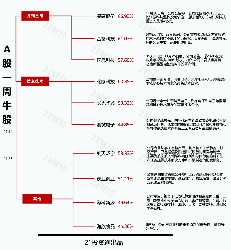 本期牛股榜中,品高股份(688227.SH)以66.93%的周涨幅夺魁,金富科技(003018.SZ)以61.07%的涨幅位居第二,昀冢科技(688670.SH)、长光华芯(688048.SH)、国晟科技(603778.SH)、航天环宇(688523.SH)周涨幅超53%。本期牛股榜十只个股过去一周累计涨幅均超过44%。