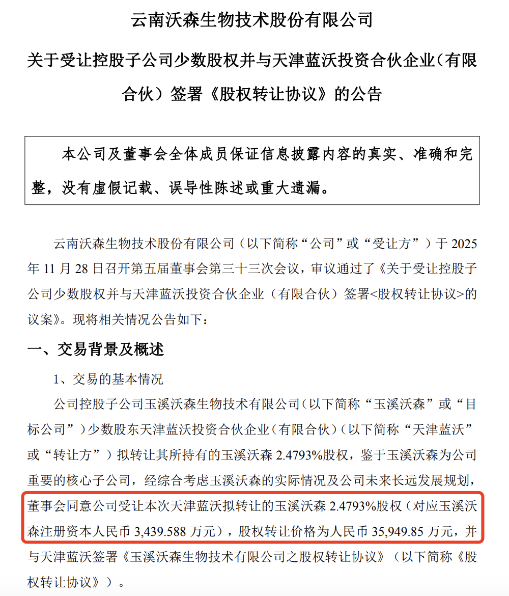 沃森生物同时公告,公司控股子公司玉溪沃森生物技术有限公司少数股东天津蓝沃投资合伙企业拟转让其所持有的玉溪沃森2.4793%股权,董事会同意公司受让本次天津蓝沃拟转让的玉溪沃森2.4793%股权,股权转让价格为人民币3.59亿元,并与天津蓝沃签署《玉溪沃森生物技术有限公司之股权转让协议》。