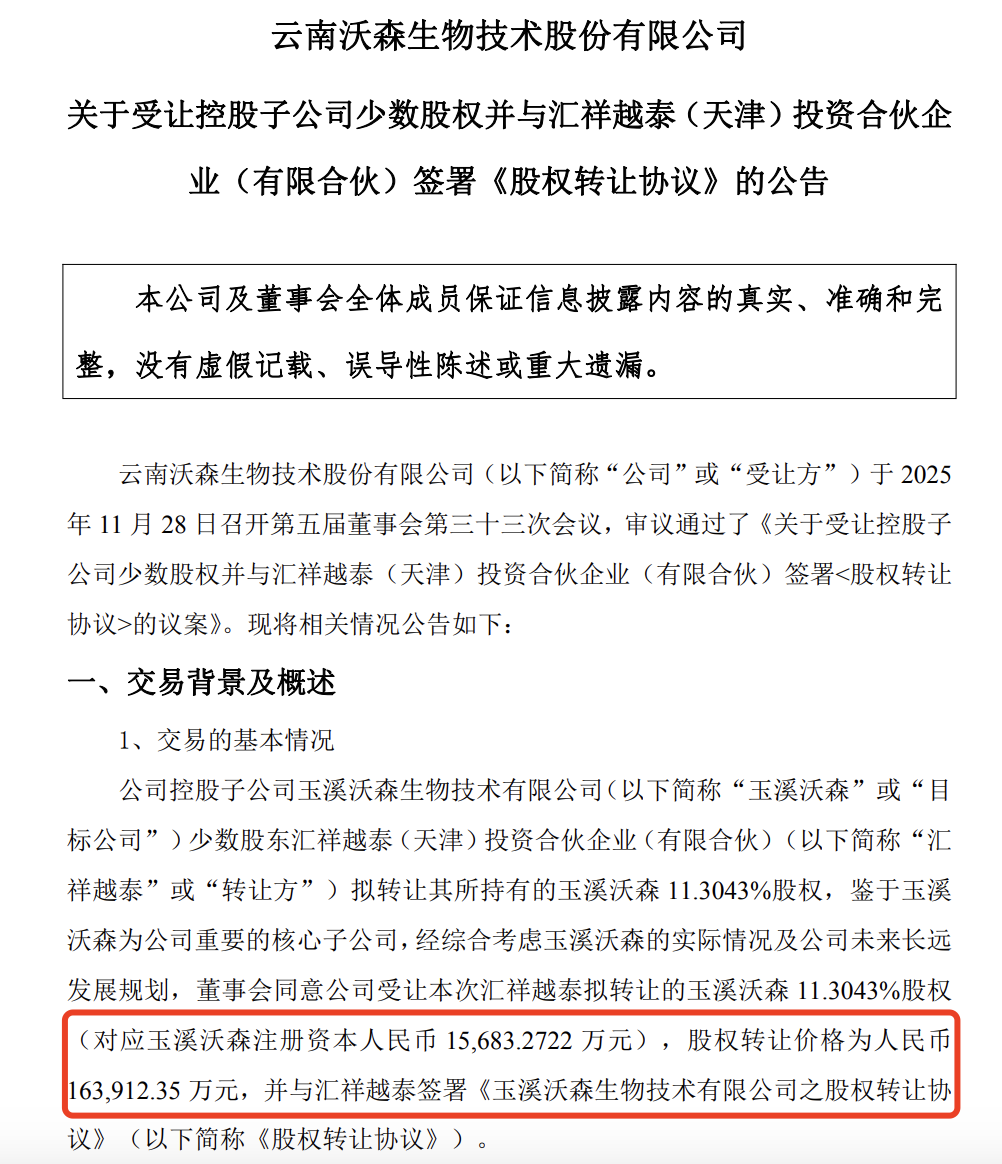 11月28日晚间,沃森生物公告,玉溪沃森少数股东汇祥越泰投资合伙企业拟转让其所持有的玉溪沃森 11.3043%股权,鉴于玉溪沃森为公司重要的核心子公司,经综合考虑玉溪沃森的实际情况及公司未来长远发展规划,董事会同意公司受让本次汇祥越泰拟转让的玉溪沃森 11.3043%股权,股权转让价格为人民币16.39亿元,并与汇祥越泰签署《玉溪沃森生物技术有限公司之股权转让协议》。