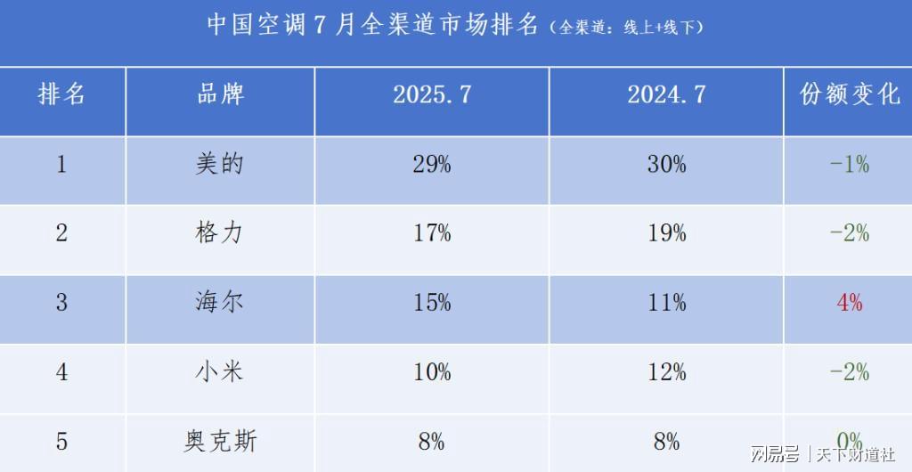 炎热的夏天,通常是空调销售的旺季,也是相关厂商兵家必争之季节。奥维云网全渠道监测显示,今年7月格力空调市场份额同比下滑2个百分点,海尔反而提升了4个百分点,美的则以29%的市场份额位居榜首。