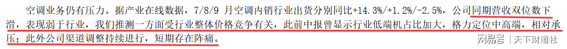 有券商研报指出,格力电器营收表现弱于行业,一方面源于行业低端机占比提升带来的价格竞争压力,格力坚守中高端定位导致短期承压;另一方面,公司渠道调整持续进行,短期存在阵痛。