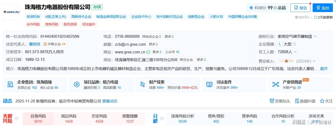 另据天眼查显示,格力电器自身风险2010条,周边风险1428条,预警提醒1237条。