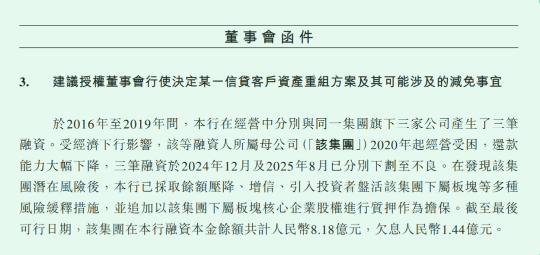 据泸州银行公告披露,该行于2016年至2019年向同一集团旗下的三家公司发放贷款,2020年起该集团经营受困,还款能力大幅下降,三笔贷款于2024年12月、2025年9月下划至不良。在发现该集团潜在风险后,泸州银行已采取余额压降、增信、引入投资者盘活该集团下属板块等多种风险缓释措施,并追加该集团下属板块核心企业股权进行质押担保。