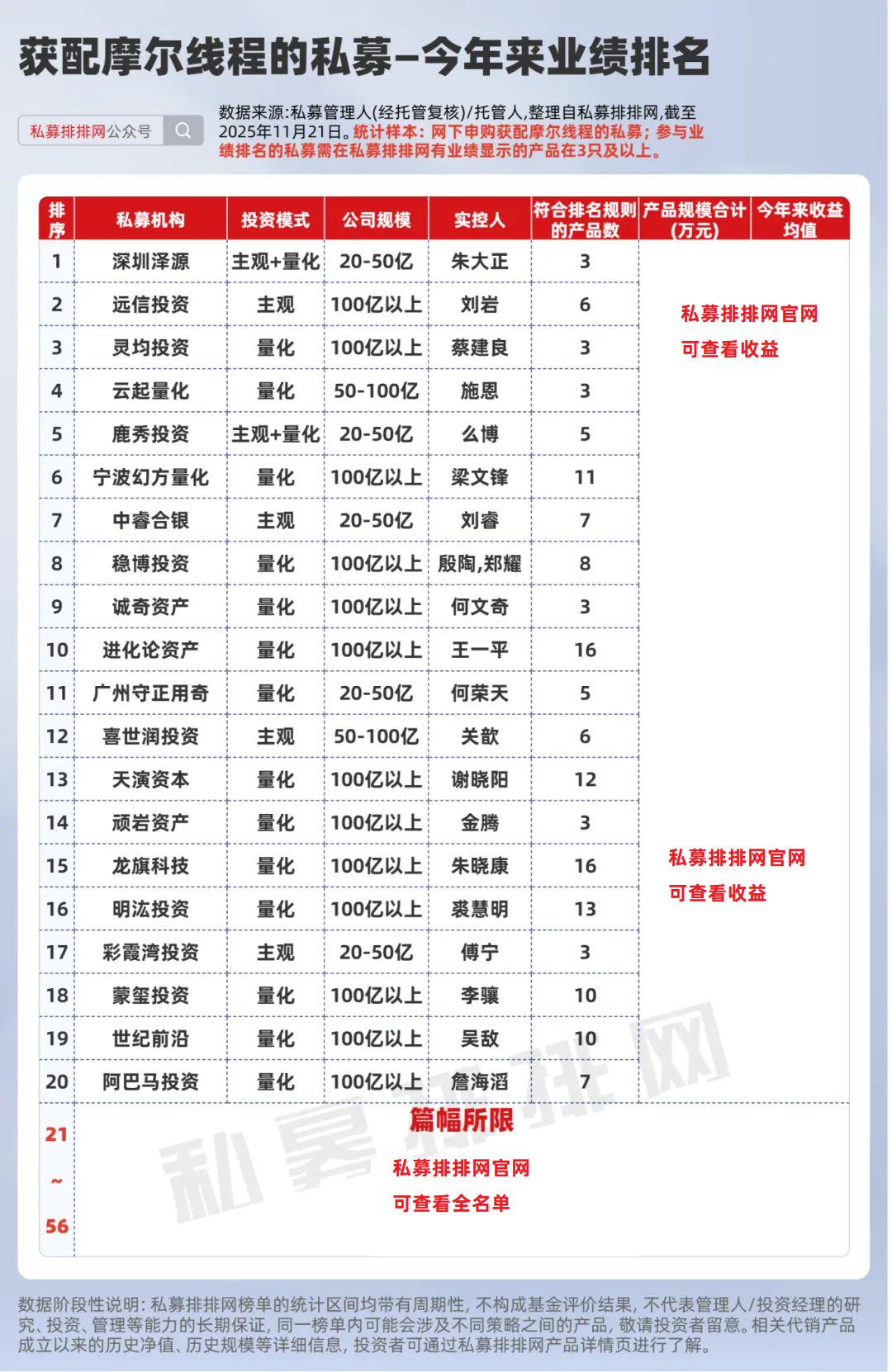 从参与摩尔线程打新的私募业绩来看,截至11月21日,在私募排排网符合排名规则产品数在3只及以上的私募共有56家;它们管理的419只产品规模合计约626.25亿元,今年来收益均值高达28.38%。