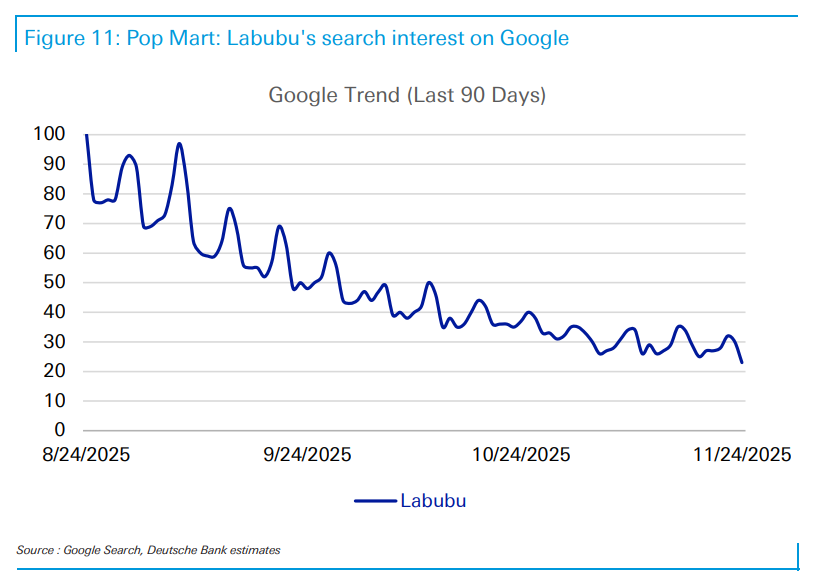 与此同时,Labubu在谷歌上的搜索热度自2025年中期以来持续下降。这意味着新用户的关注度正在降低,而货源却源源不断,这一剪刀差将不可避免地导致单店生产力下降。