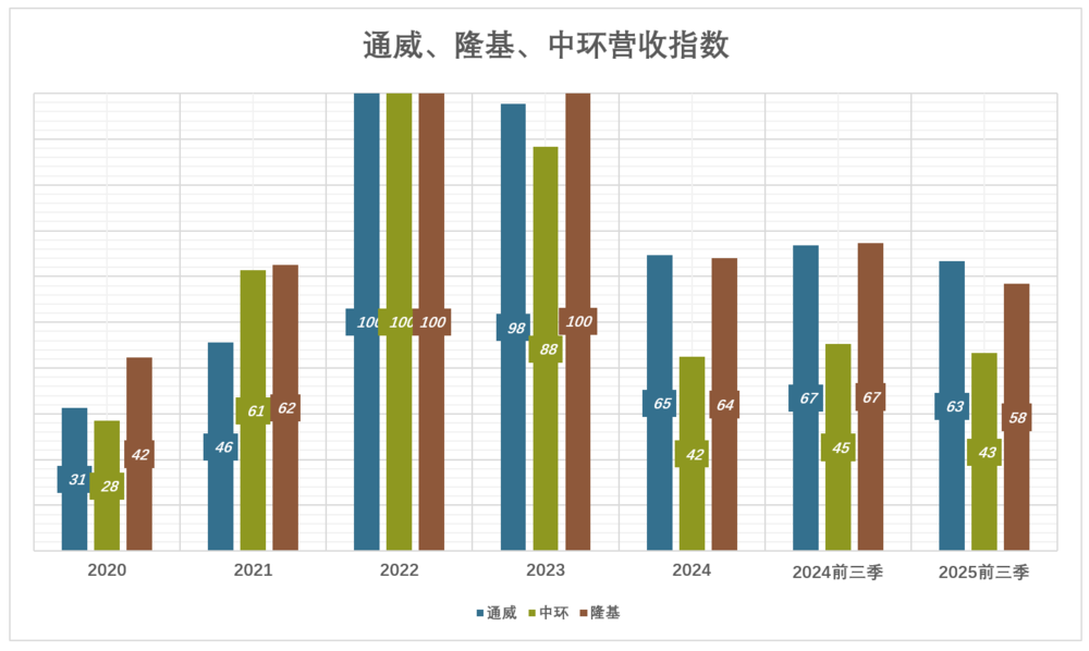 2023年,通威、隆基、中环营收分别为1391亿、1295亿、591亿。通威、中环营收指数分别为97.7、88.3,只有隆基高居100.4; 2024年,大家都扛不住了,通威、隆基、中环营收指数分别为64.6、64、42.4,中环最惨; 2025年前三季,形势仍未好转,通威、隆基、中环营收指数(以2022年前三季为基准)分别为63.3、58.5、43.3。