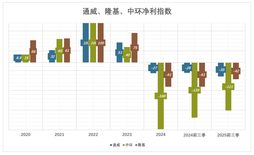 2023年,通威、隆基、中环扣非净利润分别降至136.1亿、108.4亿、25.7。隆基利润指数保持在75.2、通威51.3几乎腰斩、中环跌破40。 2024年至暗时期,通威、隆基、中环利润指数分别为-26.6、-60.7、-168.1。 2025年前三季,中环、隆基亏损收窄(中环亏损60.3亿、同比减亏12.8%,隆基亏损44.5亿、同比减亏31.2%),通威亏损放大(亏损54.7亿、同比多亏35.5%)。