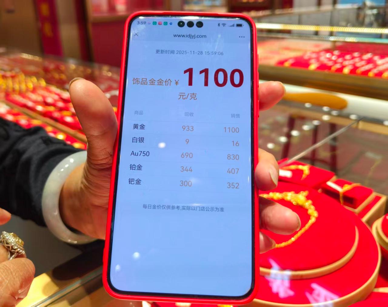 周末的生意似乎好一些。11月29日(周六)中午,记者在水贝金座大厦地下一层看到,人气确实要比一天前高一些,一些柜台有消费者在试戴。其中,一对年轻人很快就选好了结婚用的“三金”。大厦屏幕显示,当时首饰金为1105元/克,比一天前涨了几元钱,但克价依然比周大福当日金价低223元。