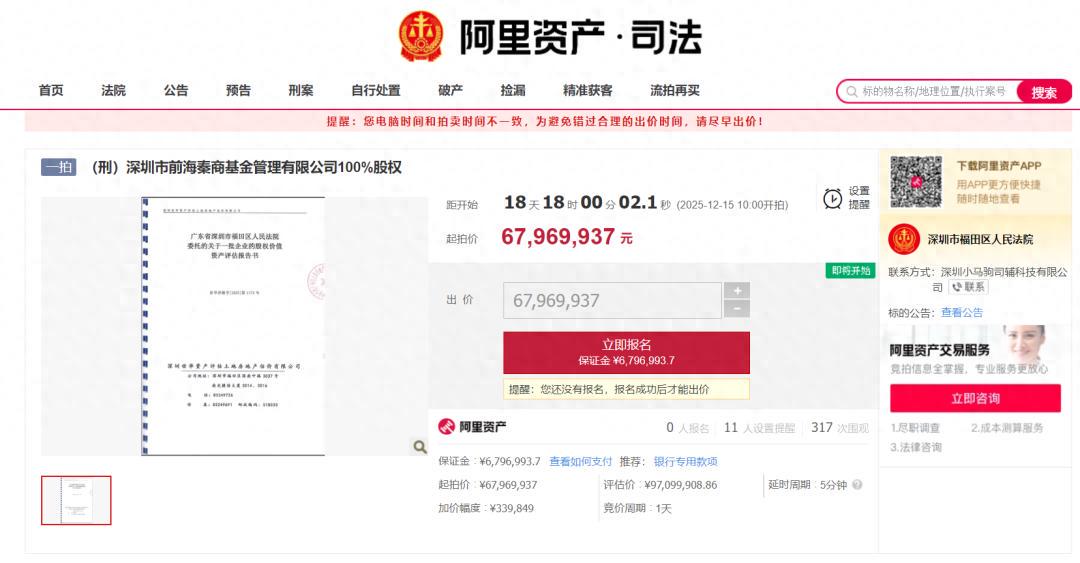 深圳市福田区人民法院将于2025年12月15日10:00-12月16日10:00,在阿里资产平台对标的“(刑)深圳市前海泰商基金管理有限公司100%股权”进行公开拍卖。