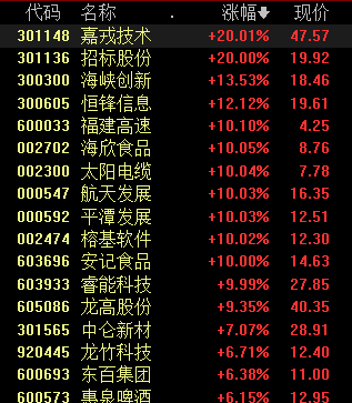 具体来看,福建本地股逆势爆发,嘉戎技术、招标股份、福建高速、平潭发展等10股涨停。