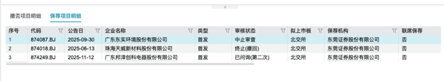 Wind数据显示,2025年以来,由东莞证券担任保荐机构的三单排队IPO项目拟上市板块均为北交所。除广东邦泽创科电器股份有限公司项目目前处于二次问询阶段外,广东东实环境股份有限公司已中止审查,珠海天威新材料股份有限公司(下称:天威新材)项目现已撤回申报。