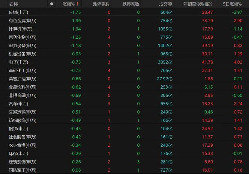 板块收跌居多,整体涨跌幅温和。石油石化、轻工制造、家用电器、建筑材料、通信、煤炭、房地产等板块护盘,但传媒、有色金属、计算机、医药生物、电力设备等板块跌幅超过1%。