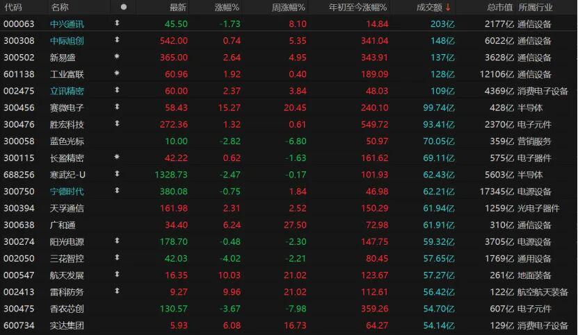 市场共计1544只个股收涨,涨停股54只;3740只个股收跌,跌停股7只。今日有5只个股日成交额超过100亿元,昨日涨停的中兴通讯今日回调1.73%报45.5元/股,中际旭创微涨0.74%报542元/股,新易盛收涨2.64%报365元/股,工业富联、立讯精密涨约2%,赛微电子涨幅超过15%,寒武纪-U跌幅超过2%。东方财富继续下挫,收跌2.08%报22.61元/股。