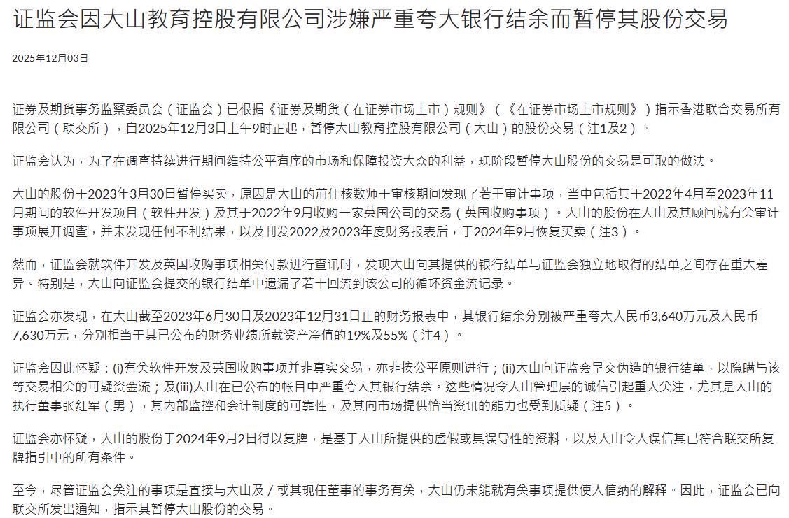 同时,香港证监会还怀疑,大山教育于2024年9月2日得以复牌,是基于公司提供的虚假或具有误导性的资料。