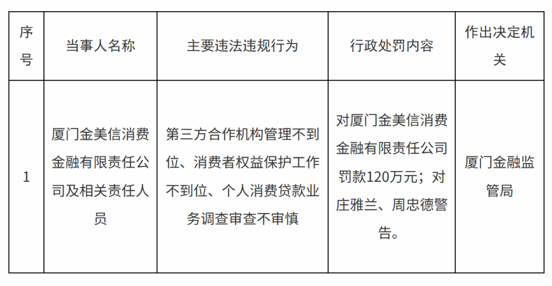 厦门金美信消费金融公司因第三方合作机构管理不到位、消费者权益保护工作不力及个人消费贷款业务调查审查不审慎,被国家金融监督管理总局厦门监管局处以120万元罚款。