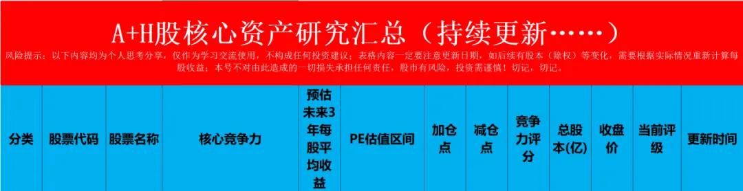 先说一个事情《A+H股核心资产研究汇总》表格已经更新上传到专栏,表内所有公司我都已经核算了估值,不符合预期的调整了加仓价和减仓价。