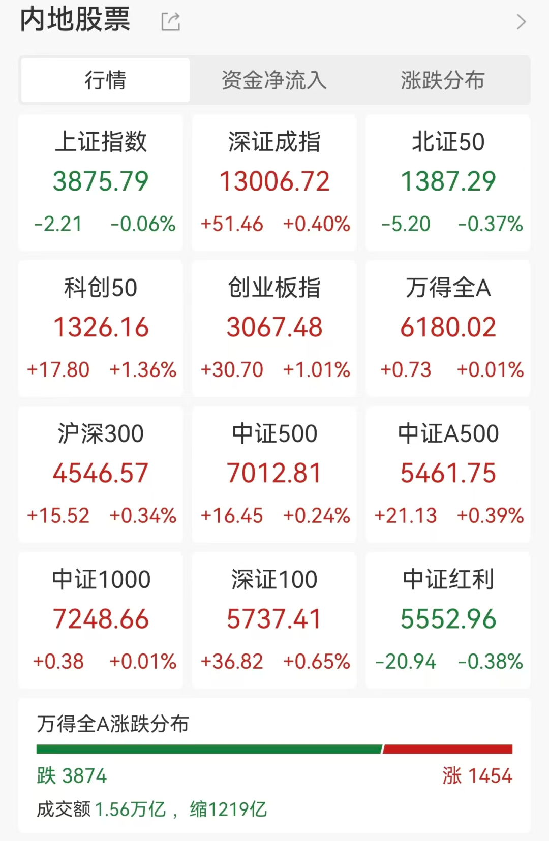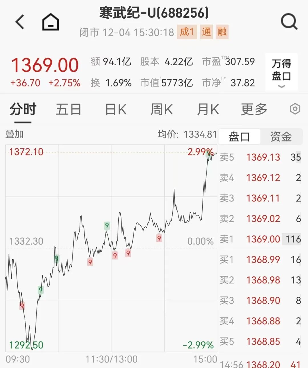 12月4日,A股市场探底回升,创业板指涨超1%,早盘一度跌超0.5%。沪深两市成交额1.56万亿,较上一个交易日缩量1219亿,全市场超3800只个股下跌。