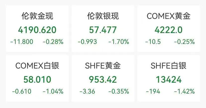 国际贵金属震荡走低,现货白银领跌,日内跌幅一度超2%,截至15:30,现货白银下跌1.7%,报57.477美元/盎司,现货黄金跌近0.3%,跌破4200美元/盎司。