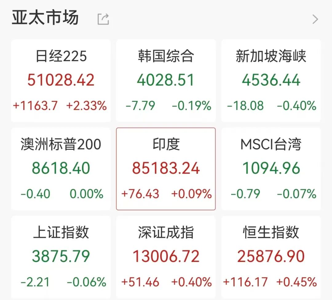 亚太股市涨跌不一,日经225指数涨2.3%,机器人和芯片股涨势强劲,软银集团涨超9%领涨。韩国综合指数、新加坡海峡指数、澳洲标普200指数等有所下跌。