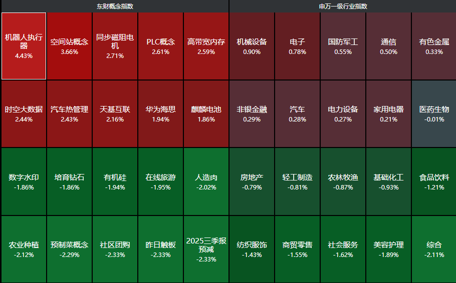 分行业来看,机械设备、电子、国防军工、通信、有色金属等行业领涨,综合、美容护理、社会服务、商贸零售、纺织服饰等行业领跌。