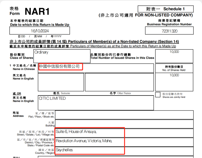 香港公司注册处信息显示,中信大基建有限公司,成立于2020年10月,公司类别为私人股份有限公司,商业登记号码为72311320。进一步查询发现,中信大基建有限公司的股东为中国中信股份有限公司,是一家注册在非洲小国的公司。此公司与真正有中信背景的中国中信股份有限公司同名。