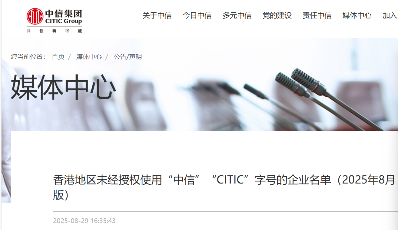 实际上,中信大基建公司、中信城债企业管理有限公司与中信集团没有关系。在中信集团2025年8月所发布的香港地区未经授权使用“中信”“CITIC”字号的企业名单中,中信大基建有限公司和中信城债企业管理有限公司同样在列。