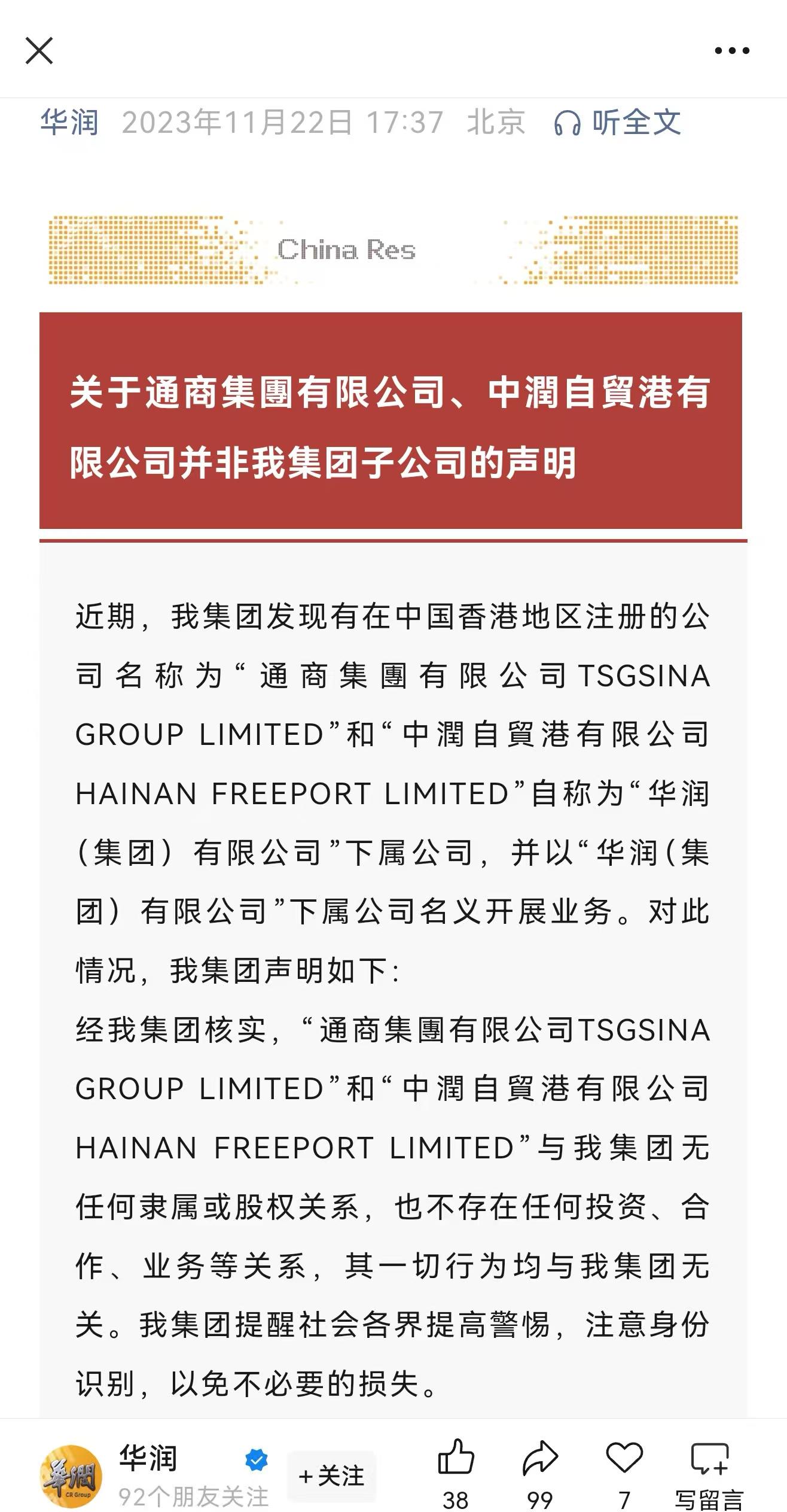 华润(集团)有限公司表示,经核实,这两家公司与华润集团无任何隶属或股权关系,也不存在任何投资、合作、业务等关系,其一切行为均与我集团无关。提醒社会各界提高警惕,注意身份识别,以免不必要的损失。