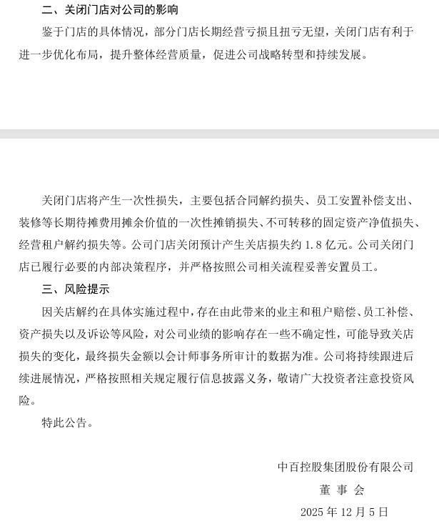 中百集团表示,关闭门店将产生一次性损失,主要包括合同解约损失、员工安置补偿支出、装修等长期待摊费用摊余价值的一次性摊销损失、不可转移的固定资产净值损失、经营租户解约损失等。公司门店关闭预计产生关店损失约1.8亿元,因关店解约在具体实施过程中,存在由此带来的业主和租户赔偿、员工补偿、资产损失以及诉讼等风险,对公司业绩的影响存在一些不确定性,可能导致关店损失的变化,最终损失金额以会计师事务所审计的数据为准。