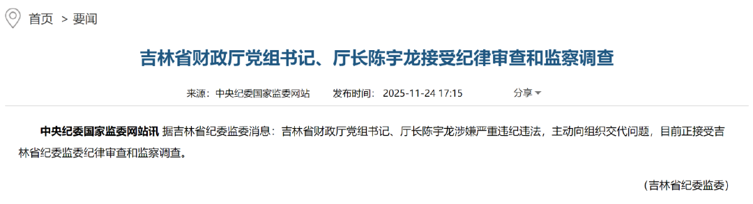 值得注意的是,十天前,吉林省财政厅厅长陈宇龙主动向组织交代问题,目前正接受审查调查,他的另一个身份是吉林银行前董事长。