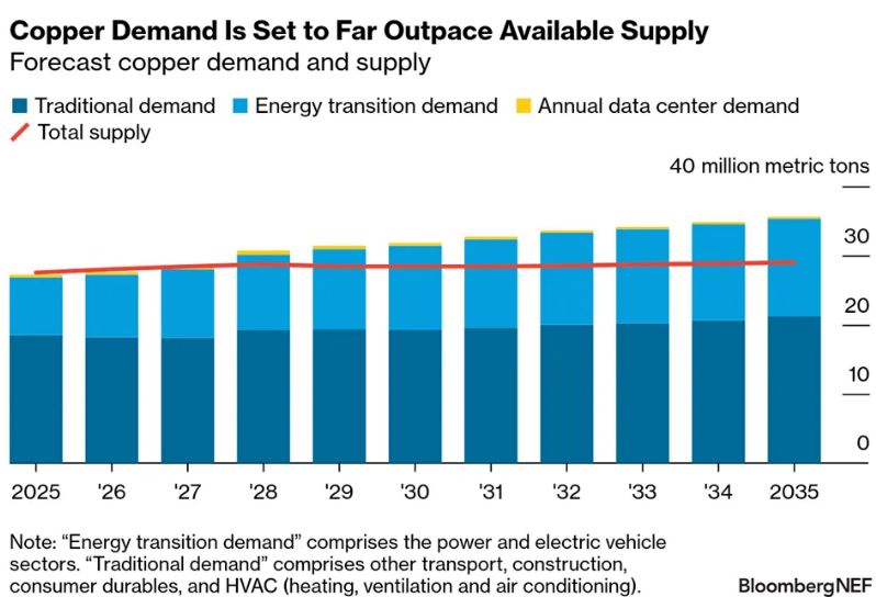 数据中心、电动汽车、可再生能源、电网投资、军火生产都需要大量的铜。据彭博社估算,未来十年,仅仅新建数据中心每年就需要约40万吨的铜,并在2028年达到57.2万吨的峰值。